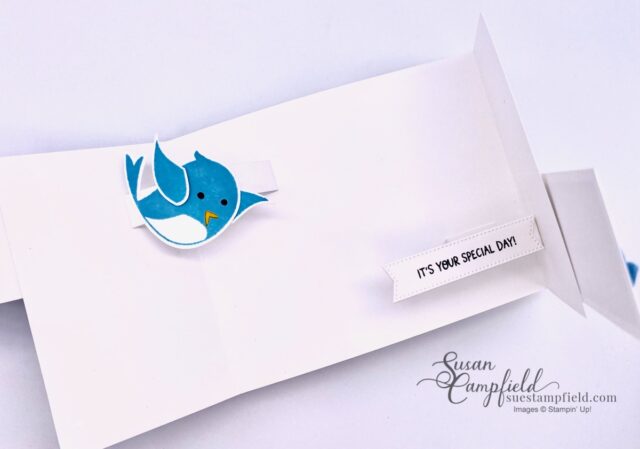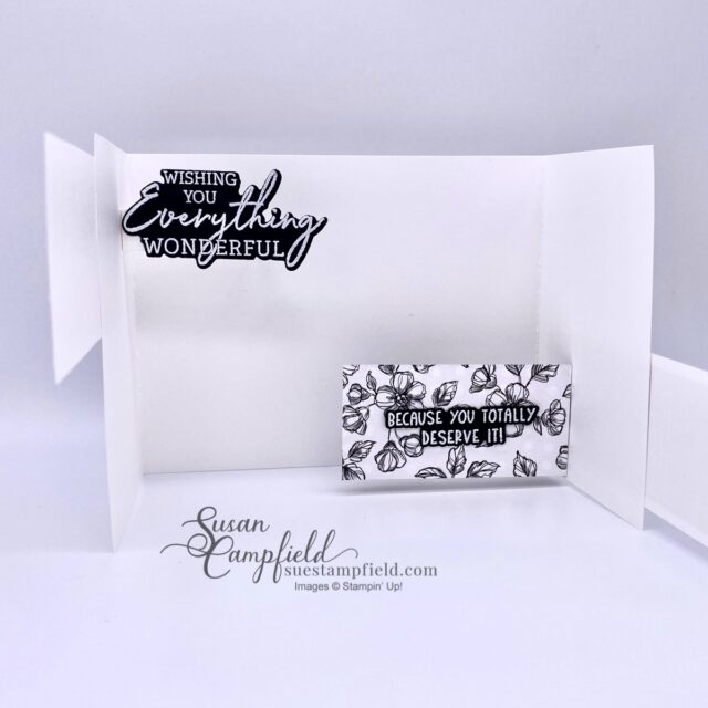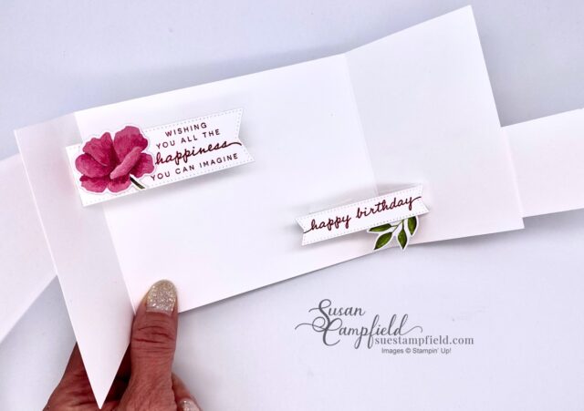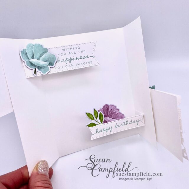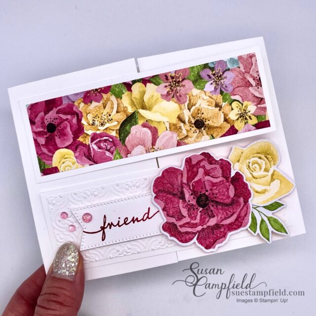 Surprise! The inside of the card features two “pop-up” messages that appear to float – so fun! Welcome to the Suestampfield May Crafternoon featured fun fold! Each month I design a fun fold and then make many different designs using that fold. I have a video tutorial showing the basics of the freestanding floating panel cards, and an option to purchase a detailed tutorial bundle for ALL of the projects. This first version features the gorgeous Stampin’ Up! Designer Series Paper Hues of Happiness and the Happiness Abounds Bundle. The dies in the bundle cut out the flowers in the paper – which makes card making so easy!