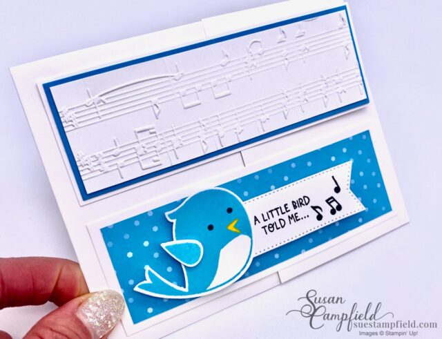 Tweet! The Sweet Songbirds bundle make super cute birthday and celebration cards! The Merry Melody Embossing Folder was the perfect pairing for the musical notes in this set. I bet you can guess what I put on the inside of the card!