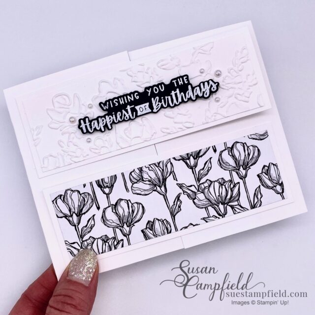 Black and white cards are so elegant – prefect for so many occasions. For this version I used the versatile Charming Sentiments bundle, the Painted Posies 3D embossing folder, and the Perfectly Penciled Designer Series Paper.