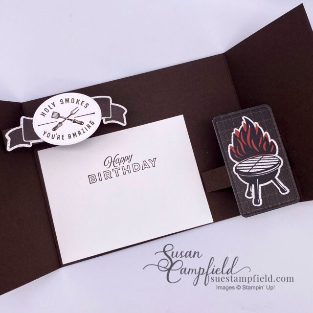 Inside the card i used more of the preprinted die cuts (the banner and the grill). The “Holy Smokes” sentiment is stamped and die cut from the He’s All That bundle. The Happy Birthday sentiment is from the Celebrating You stamp set.
