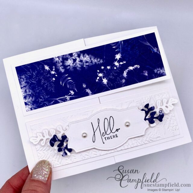 The May 2022 Suestampfield Crafternoon Creative Escape fun fold card hides a happy surprise inside – meet the Criss-Cross Floating Message Cards!
