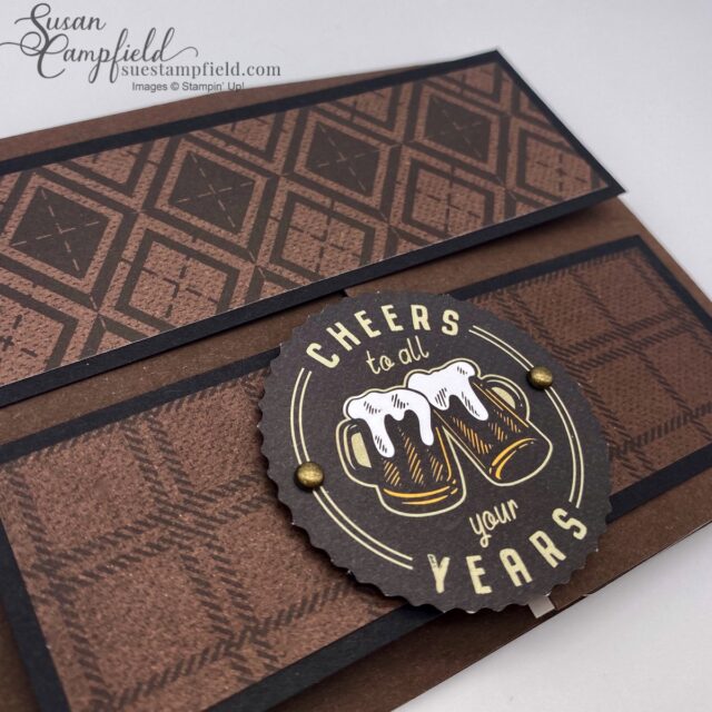 My paper crafting friends tell me that masculine cards are always the hardest for them to design. Fortunately the He’s The Man Suite solves that problem. The Designer Series paper in this suite comes with preprinted die cuts that create handsome cards quickly. This Cheers To All Your Years medallion is one of those preprinted die cuts and it was the perfect focal point for the front for my card.