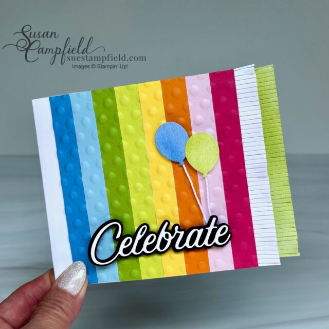 The colors I used on the front are Azure Afternoon, Balmy Blue, Granny Apple Green, Lemon Lime Twist, Daffodil Delight, Pumpkin Pie, Bubble Bath, and Melon Mambo. The little balloons are die cut from the Bright & Beautiful Designer Series Paper.