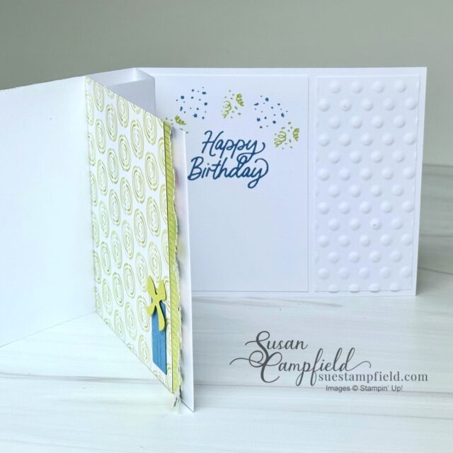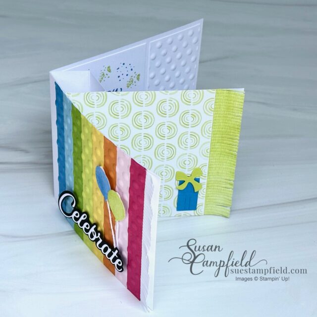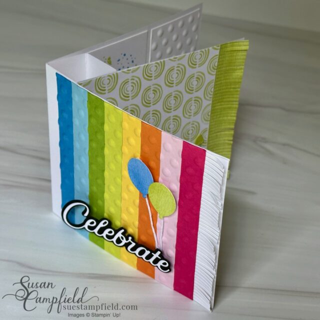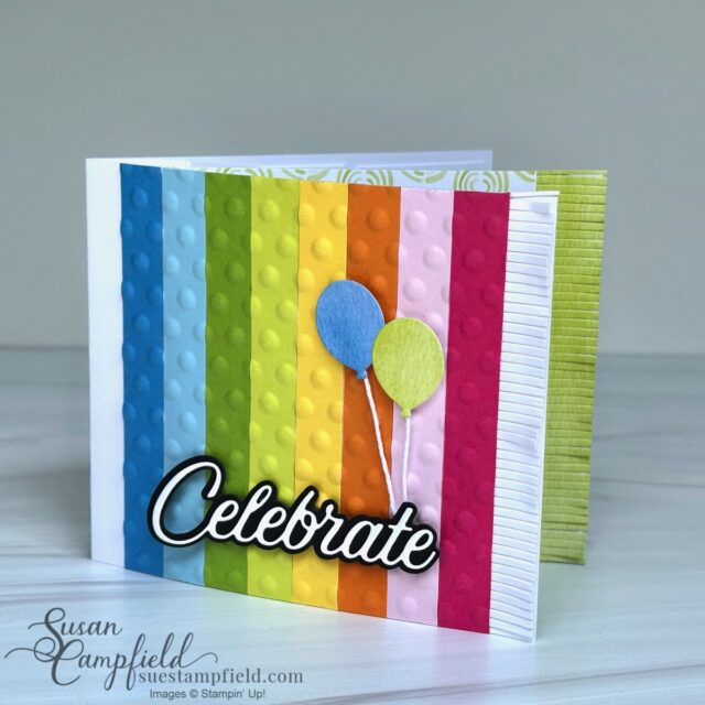 The cute stamp images in the Beautiful Balloons bundle are perfect for decorating the back panel. The embossing folder comes from the three pack Basics Embossing Folders and is the hobnail glass design. It’s like a whole birthday party packed into one card!