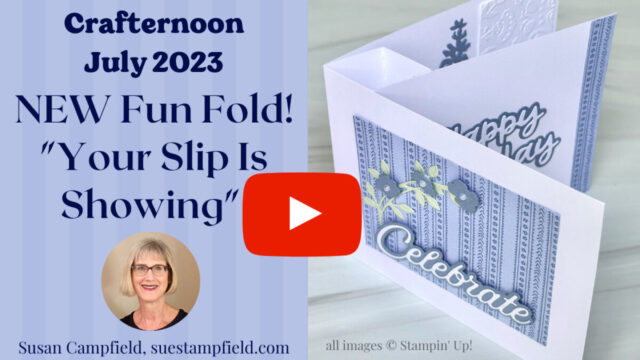 Customers who placed a $50 order (before tax and shipping) in June, received the packet to make this Your Slip Is Showing card in July. You can join me for next month’s Crafternoon to learn another unique, new fun fold if you place a qualifying order this month!