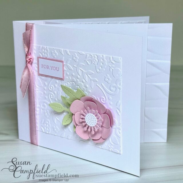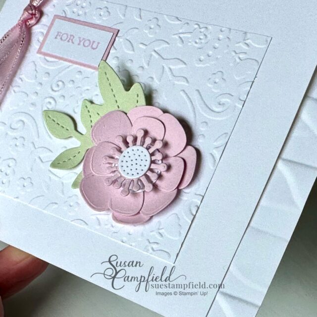 The Stampin’ Up! Paper Florist dies make the most stunning flowers! And they are easy to use. In the step-by-step tutorial, I walk you through how to make this pretty card. The front panel features the Cane Weave 3D Embossing Folder and the Basic Border dies add a pretty scallop on the front of the card…