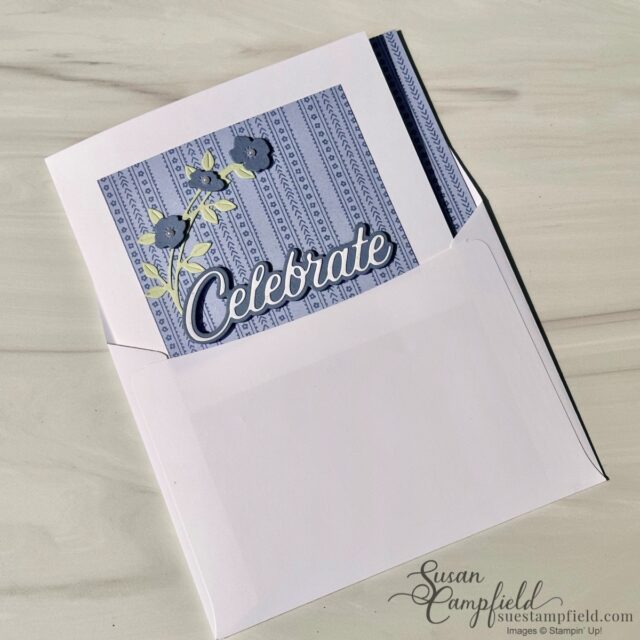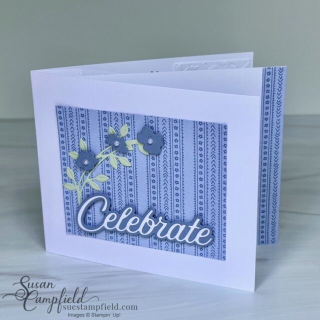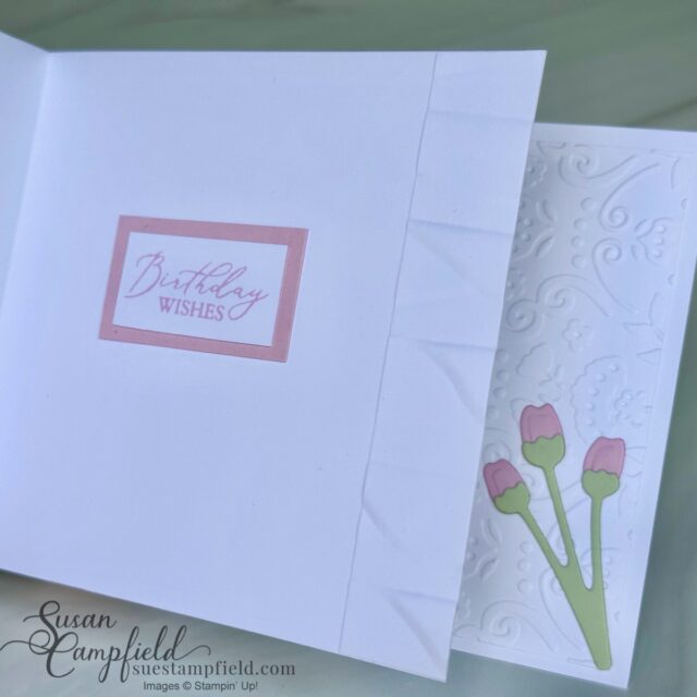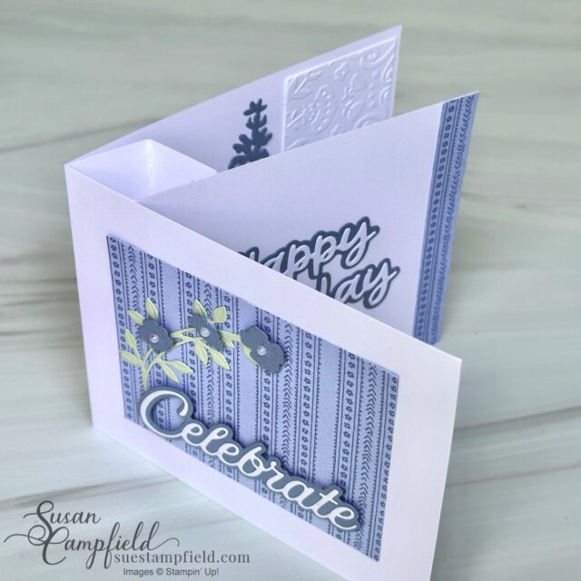 In this version the “slip”, or the edge of the center panel that is peeking out past the card front, is decorated with a 1/2″ piece of Designer Series Paper. In the other version below, I share lots of other options.