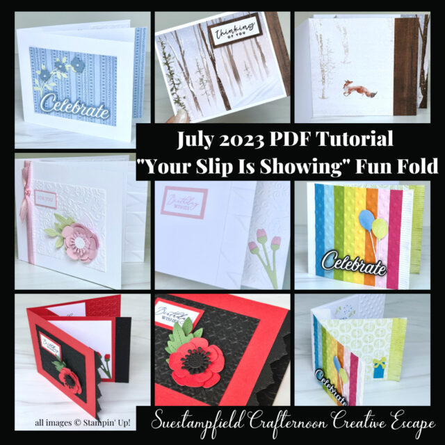 Need some creative inspiration? I have five versions of a new fun fold card in this post. I created the Your Slip Is Showing Fun Fold for the Suestampfield Crafternoon Creative Escape in July.
