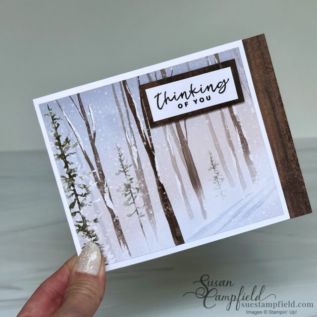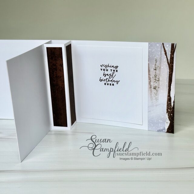 For this version of the Your Slip Is Showing I used the beautiful One Horse Open Sleigh Designer Series Papers from the Stampin’ Up! Online Store to create a nature themed / masculine card. The “Thinking of You” sentiment on the front is from the Season of Chic stamp set. The “slip” is decorated with a woodgrain pattern from the papers. This absolutely gorgeous One Horse Open Sleigh Designer Series Paper will be available in the Stampin’ Up! Online store while supplies last as part of the new online exclusive products.