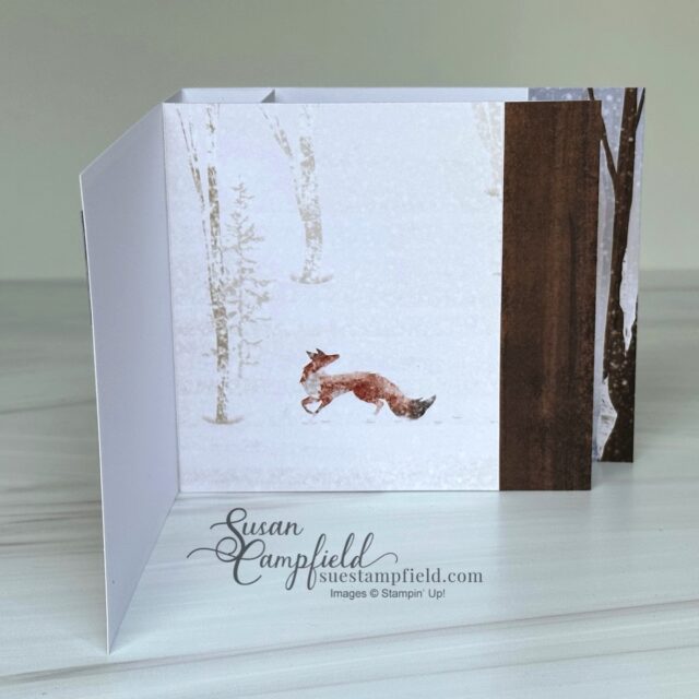 The rest of the “slip” is decorated with the fox pattern. In fact, the woodgrain design is the other side of the paper with the fox pattern. The step-by-step directions for how to cut each of the two patterns of your One Horse Open Sleigh Designer Series Paper are all in the Your Slip Is Showing Fun Fold Tutorial so that you can recreate this card exactly.