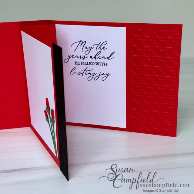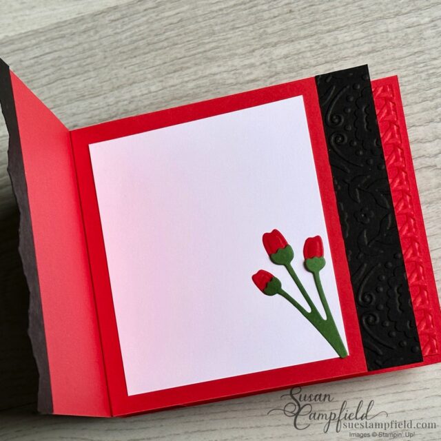 Inside there is a pretty bouquet from the Paper Florist dies on the rest of the center “slip” panel. Poppy Parade Cardstock and Basic Black make a stunning combination!