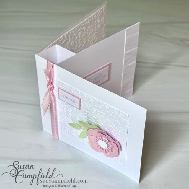Pretty in pink! I had so much fun with the Paper Florist dies that I could not resist making another version of the Your Slip Is Showing Fun Fold card in Bubble Bath and Basic White. For this soft and sweet version the Cascading Ruffles makes the perfect “slip” decoration. In the tutorial bundle I walk you through how to make all of these cards!