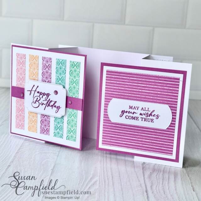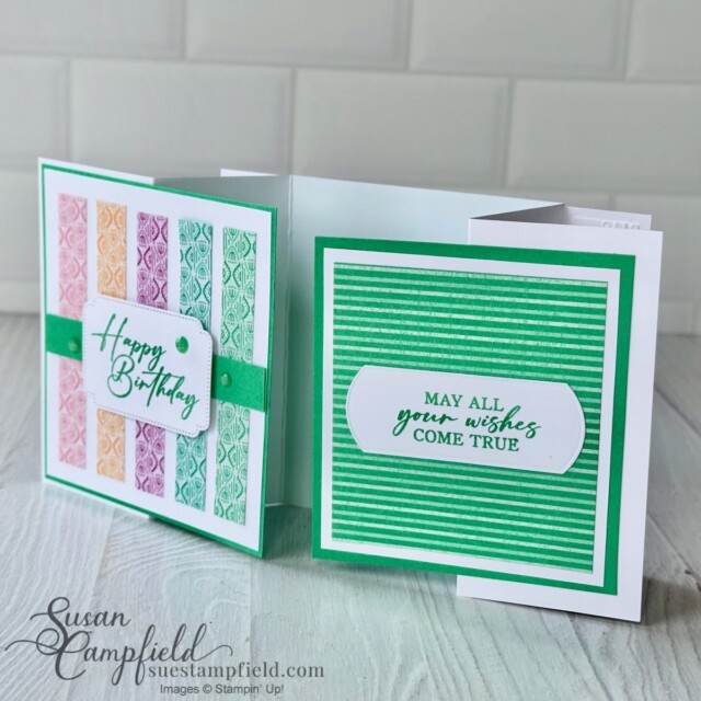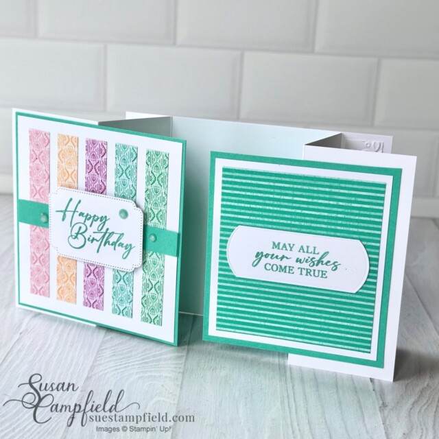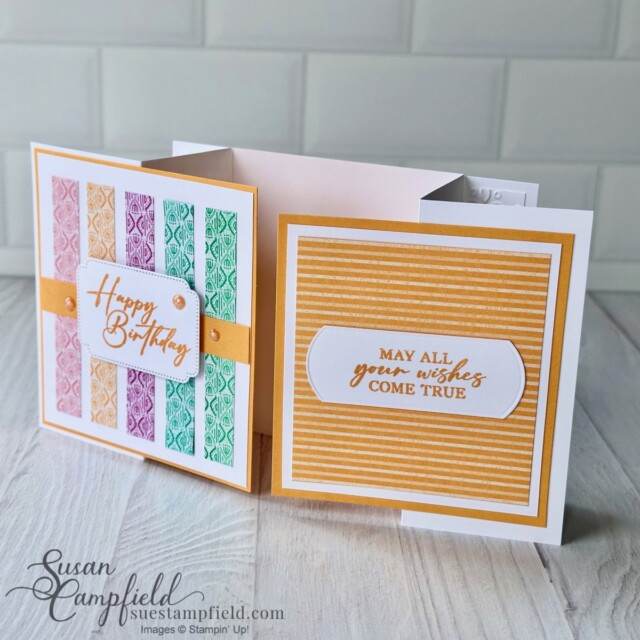 This version of the Double Stack Display card was the make and take for the March Crafternoon virtual class. Customers who placed a product order of $50 in my Stampin’ Up! online store before tax and shipping in February received the packet in March to make this card along with me in the video.