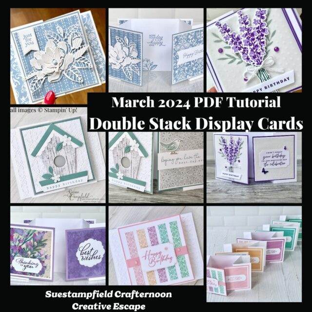 In March’s Crafternoon video, we once again dived into the world of fun fold cards… with a twist. Get ready to double the fun with the Double Stack Display Card! These 5 (or should I say 9??) freestanding cards not only visually stunning but there is a “top stack” on the front of the card and an “inside stack” inside the card which provides ample space for your creativity to shine. Whether you’re celebrating a birthday, sending well wishes, or simply spreading joy, these self-standing cards are sure to delight recipients of all ages.