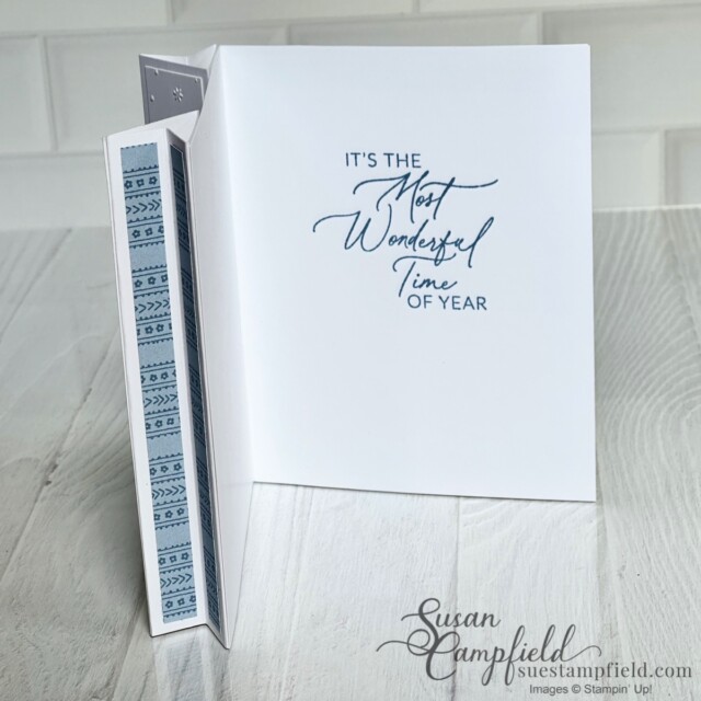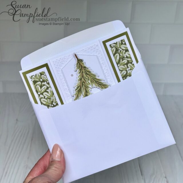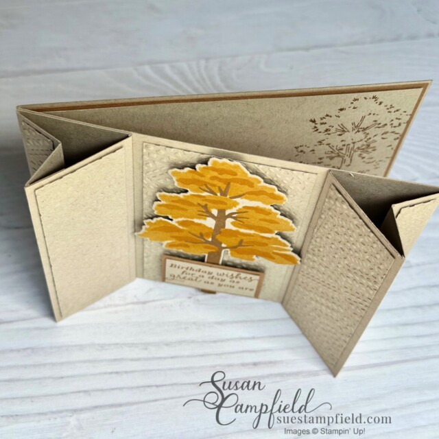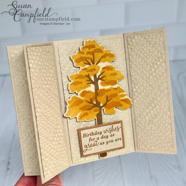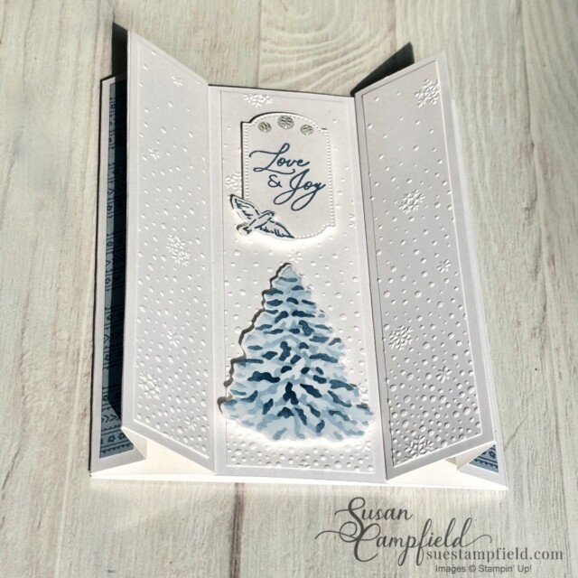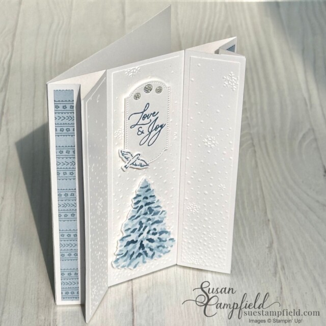 The Designer Series Paper is the Countryside Inn which carried over from the last catalog – you only need a tiny amount! One of my favorite things about the Double Arrowhead fold is being able to highlight the unique gussets on the sides of the card with pretty papers or embossed panels.