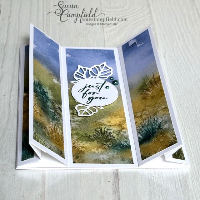 Do you see how the two side panels form an arrowhead shape from the top looking down? That’s why I called it the Double Arrowhead fold! This horizontal version of the Double Arrowhead Fun Fold Card was the make and take for the virtual July Crafternoon Creative Escape. Customers who placed a product order of $50 in my Stampin’ Up! online store before tax and shipping in June received the packet in July to make this card along with me in the video tutorial.