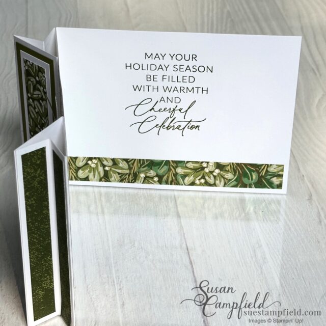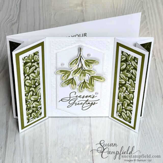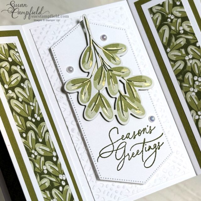 The virtual make and take packet featured the gorgeous Season of Green & Gold Designer Series Paper, the Greetings of the Season bundle, and the dies from the Golden Greenery bundle. This fun fold is easy to make, and the 3D dimension from the arrowhead panels add a “WOW” factor. This is just one of the three horizontal versions in this tutorial.