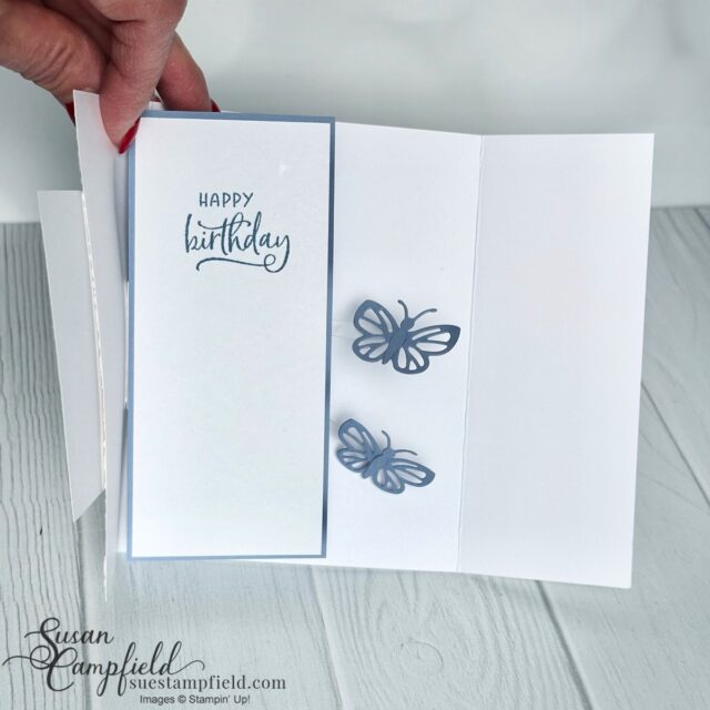 As you open and close the left gatefold side of the card, the butterflies wiggle and flutter up and down – so fun! This special fold was inspired by a swap card that I received from demonstrator Carol Johnson with standard fold version of this method. You can see Carol’s card at the bottom of this blog post. I also included step-by-step instructions for the standard fold version in the PDF tutorial as a bonus.