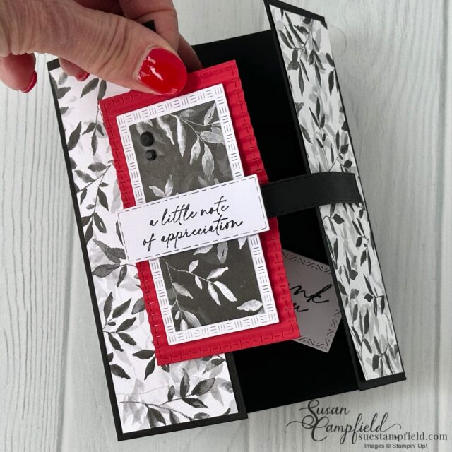 The Pop & Wiggle cards are all gatefold cards (except for the special bonus that I’ve added at the end of the tutorial of a standard fold version), so each card has a “closure” mechanism. This one has a unique “buckle” style closure made with one of the Textured Notes rectangle dies. All the instructions are in the tutorial!