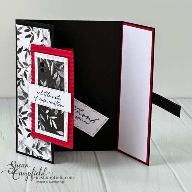 Because this Pop & Wiggle Fun Fold Card is on a dark card base, I added an inside greeting panel on the back of the right gatefold.