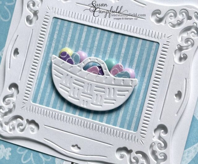 A little Easter fun! I used some dies and embellishments to create an easter basket full of eggs (more on that below). And once again I used the Storybook Friends bundle, but this time I paired it with the pretty Balmy Blue from the Subtles Assorted Designer Series Paper pack. And inside the card…