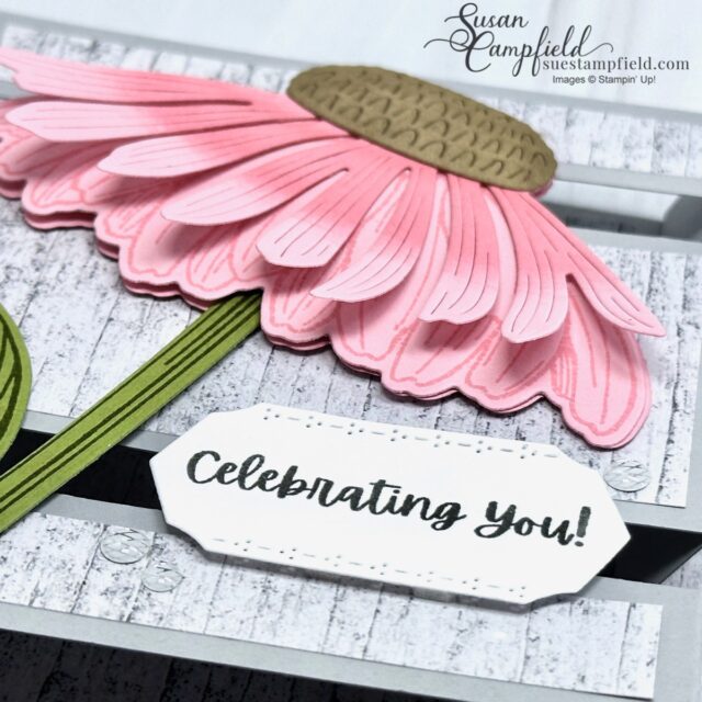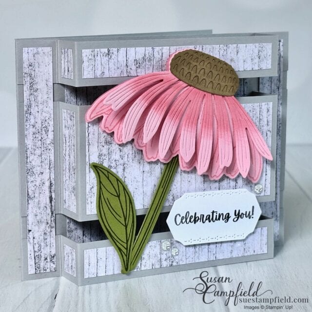 Wow! The Coneflower Celebrations bundle has some really unique dies that make a striking card! I paired this stunning flower with the Country Woods Designer Series Paper. It reminds me of a flower garden in a fenced yard!