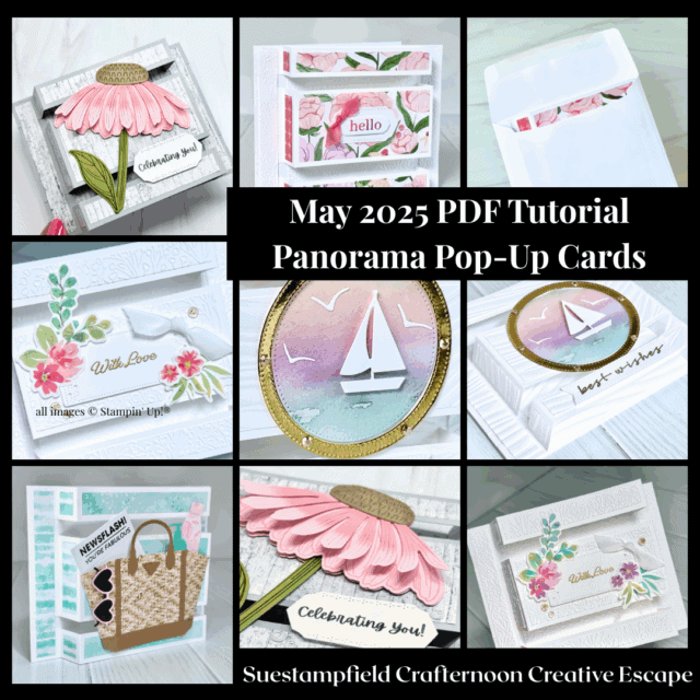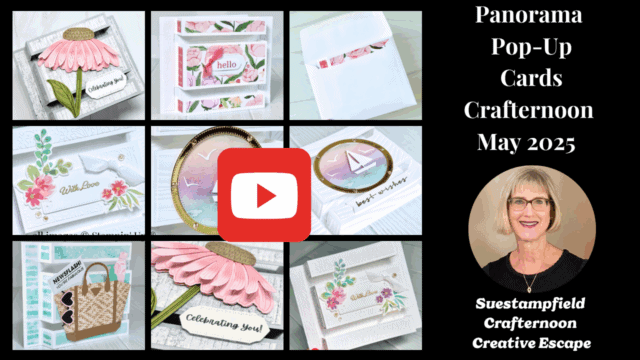 In the May Virtual Crafternoon class from Suestampfield, Iβm building on last monthβs vertical Pop-Up Parade card with a brand-new horizontal version that gives you even more space to show off your favorite papers, stamps, and die cuts. In this post, you’ll find five unique Panorama Pop-Up Card designs, a free video tutorial to follow along, and a step-by-step PDF tutorial available for purchase with instructions and photos for all five versions.