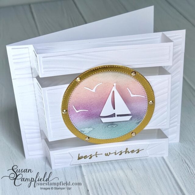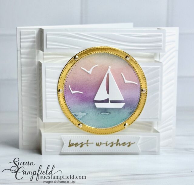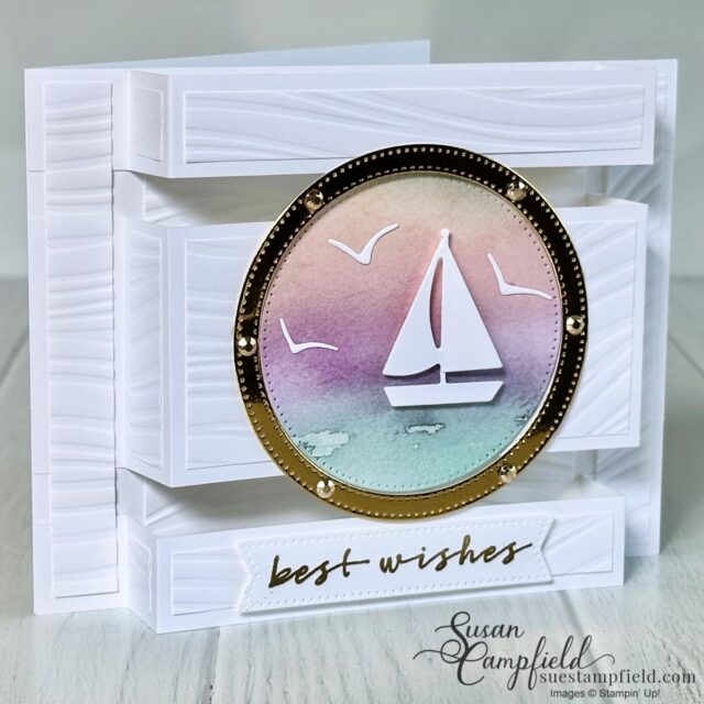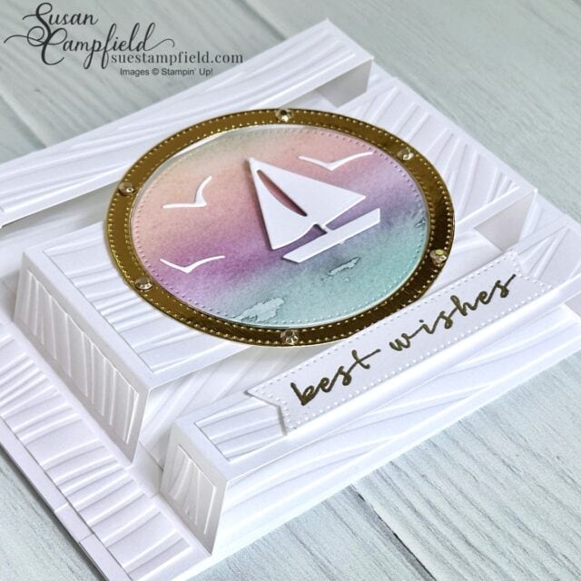 I created the porthole with the Stylish Shapes dies – all the details are in the PDF tutorial! I used the Soft Waves 3D embossing folder for this card and the Thoughtful Journey Designer Series Paper.