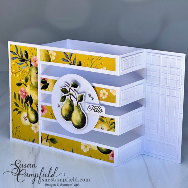 The Horizontal Quadruple Z fold cards are so pretty when they stand for display! The florals in the Painterly Pears Designer Series Paper are simply lovely. The ability to die cut some of the images out of the paper with the matching dies is an added bonus!