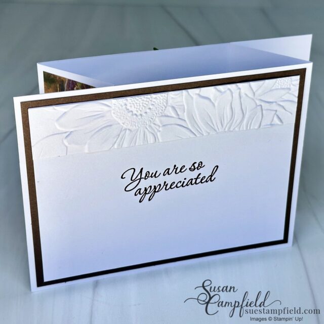 For the back of the card I kept it simple with a strip of embossed cardstock. (Love that Sunflower 3D embossing folder)!