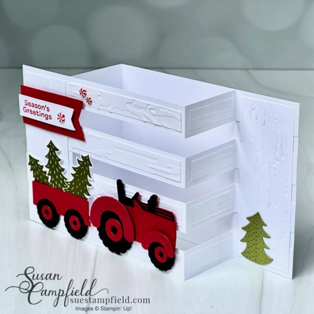 I used the Birch Wood 3D embossing folder to decorate the card so that the the Z strips would look like boards in a horizontal fence – just like you would have on a farm. The embellishments give it that extra “Christmas-y” feel! By the way, Stampin’ Up! had a hard time keeping these cute Peppermint embellishments in stock last year – make sure to order them early for your Christmas cards this year!