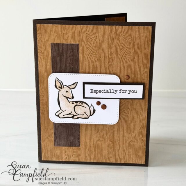 The March Product of the Month, the Notes of Spring stamp set (just $5 with a $75 order) makes a prefect masculine card! Especially when paired with the Woodgrain Wonders Designer Series Paper!