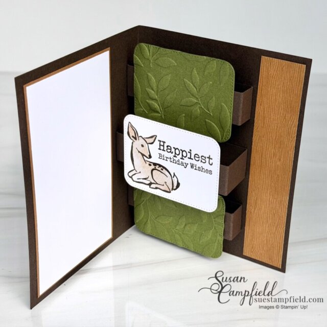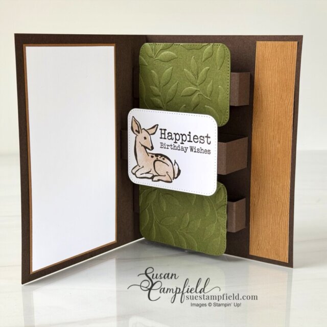 I like the Mossy Meadow leaves behind the fawn – it looks like it is tucked among the leaves in a forest! To create them I used the Paradise Garden Hybrid Embossing Folder from the Paradise Garden bundle. The bundle includes the embossing folder, dies, and the stamp set.