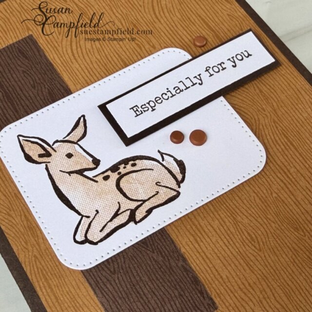 The 15 piece Notes of Spring stamp set includes “coloring fill in stamps” for all of the outline images. For the fawn I inked the color fill in stamp in Pecan Pie, stamped it on a scrap paper, and then stamped it over the outline of the fawn.