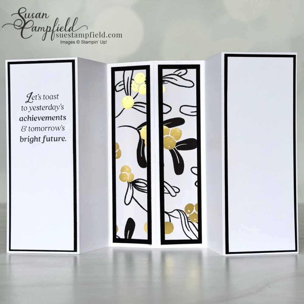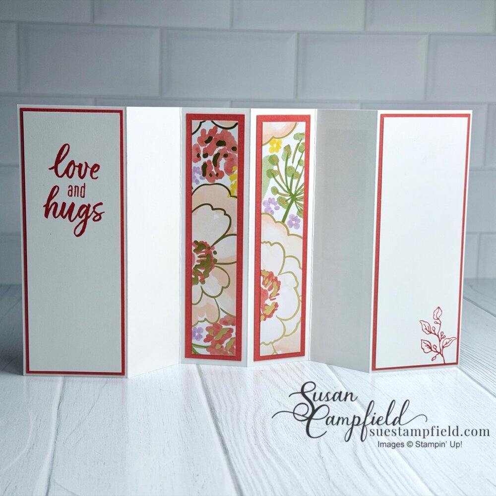 The Curvy Concertina Fun Fold is my newest original card design, and the remarkable curved front panel is truly the star of the show. When the card is fully opened, the pretty paper panel in the center arcs forward in a graceful curve, creating a striking display piece. Despite its impressive size when extended, the card folds completely flat to slide easily into a standard envelope. It’s a true wow card with simple construction—perfect for impressing friends and family without complicated interior cuts or mechanisms.