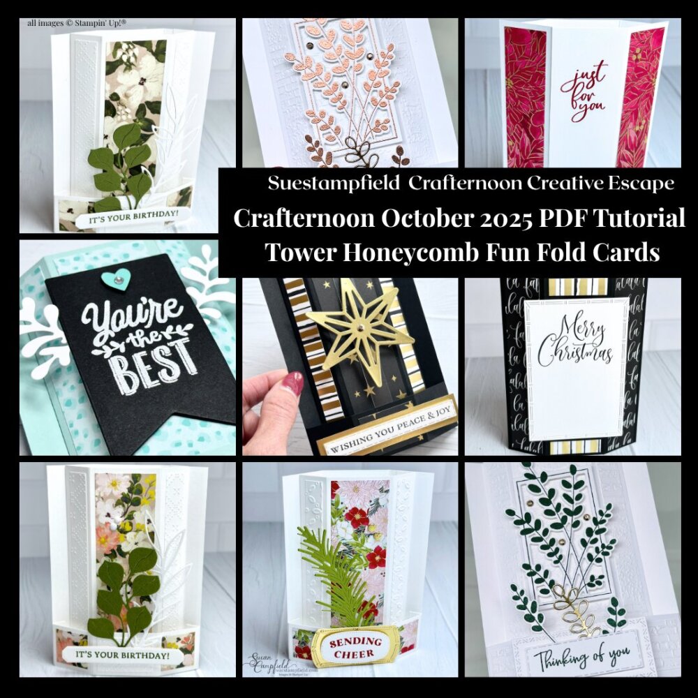 To see additional photos of the card designs, visit the coordinating blog post https://suestampfield.com/2025/10/tower-honeycomb-fun-fold-card-october-crafternoon-2025/